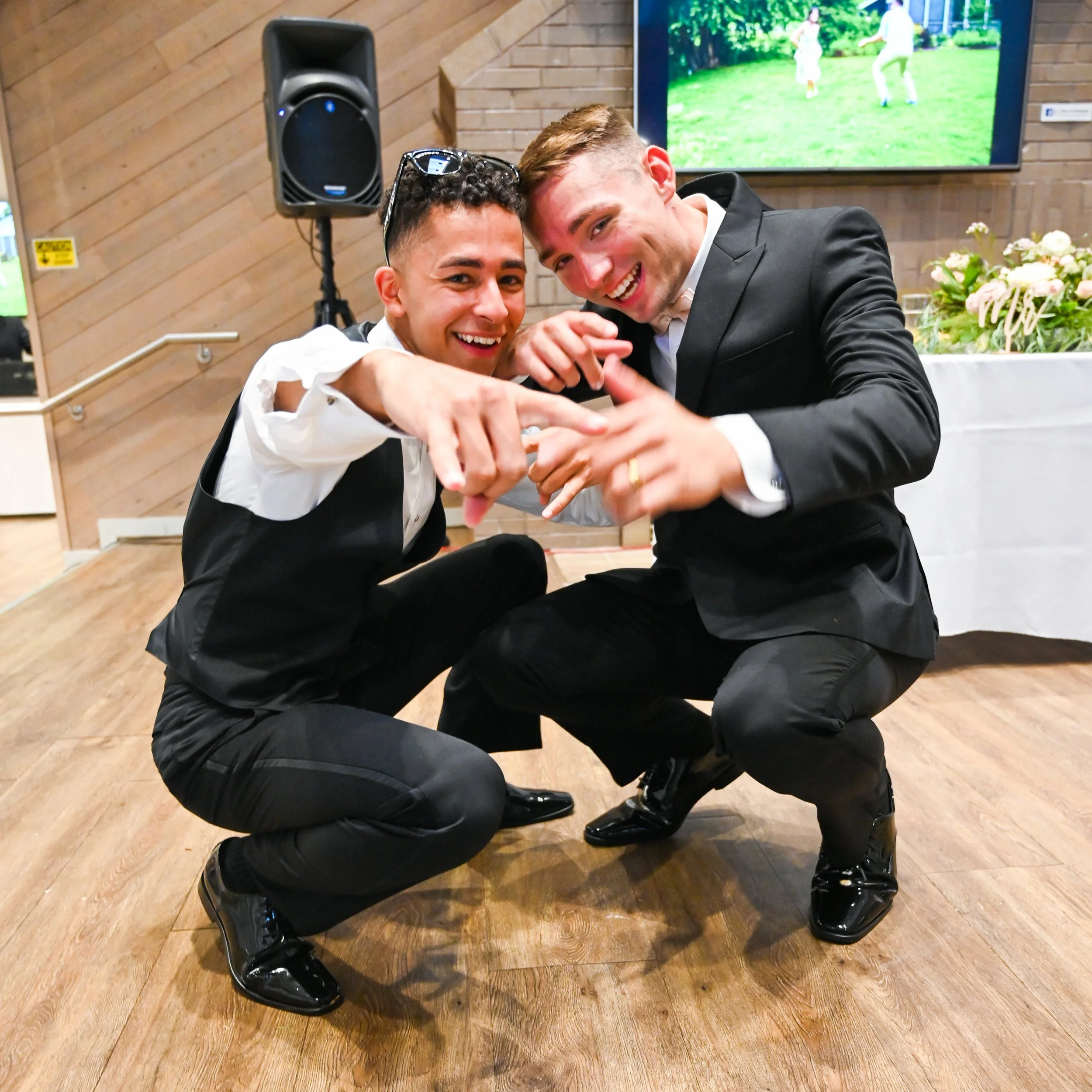 The groom and one of his groomsmen squat side by side in their formal suits, smiling at the camera and playfully pointing their fingers together. Behind them, a large screen displays the groom’s engagement photos.
